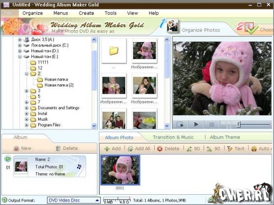 Wedding Album Maker Gold – это профессиональная программа фотоальбома, которая создает впечатляющее слайд шоу из свадебных фотографий с музыкой, переходами и DVD меню. Данная программа позволяет быстро и легко создать впечатляющие свадебные альбомы на DVD видео диски, чтобы поделиться своей историей любви по свадьбе с другими людьми. Новая версия поддерживает больше выводных форматов, такие как: MPEGI, MPEGII, MPEG-4, MP4 for iPod, PSP, 3GP сотовые телефоны, FLV , XVid AVI, AVI, видео форматы для Anrchos, Creative Zen Vision, iRiver PMP 100, YouTube, MySpace.