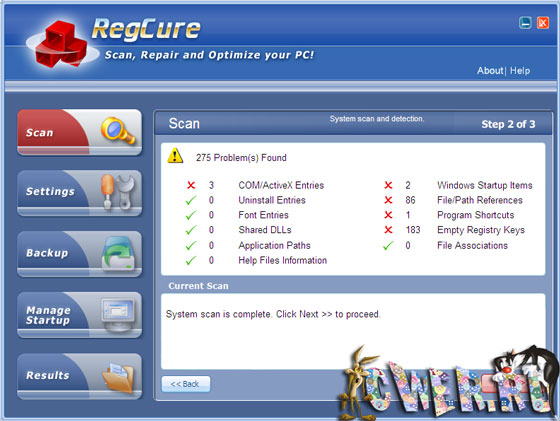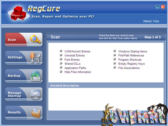 • Custom scans: you can customize how RegCure scans your registry by selecting only the items you want to be scanned. There is a list of registry items that you can check or clear during step 1 of the scanning process.