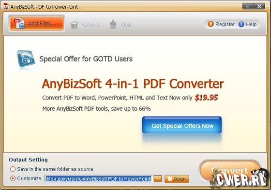 PDF to PowerPoint (PDF to PPT) - профессиональная программа для конвертации PDF файлов в презентации PowerPoint. PDF to PowerPoint конвертирует файл всего одним кликом мыши. Программа сохраняет оригинальное расположение деталей, тексты, изображения и гиперссылки и в создаваемом PPT файле. Пакетная конвертация и быстрая обработка файлов сохранят ваше время. Вы сможете конвертировать PDF файлы в PowerPoint 2010, 2007 или 2003. Просто импортируйте PDF файл, нажмите кнопку Convert и программа сама сделает все необходимое.