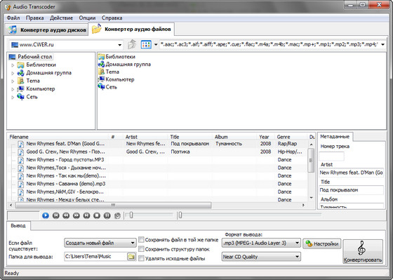 Audio Transcoder – это конвертер аудио файлов, которая позволит легко и качественно конвертировать файлы в 14 популярных аудио форматов. Программа предлагает интуитивно понятный интерфейс и массу полезных функции, включая встроенный аудиоплеер, режим перетаскивания мышью, набор предустановок качества звука и редактор мета тегов. Программа позволит вам сохранить необходимые мета теги в выходных файлах (ID3v1, ID3v2, Ogg/FLAC, APE). Режим пакетной обработки файлов поможет вам преобразовать большое количество файлов в новый аудио формат. После конвертирования файлов вы сможете загрузить их в свой любимый iPod, iPhone, MP3 плеер или PSP и наслаждаться музыкой в движении.