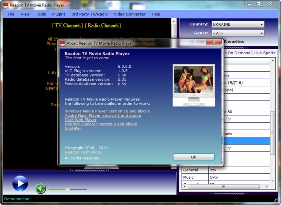 Программа имеет удобный интерфейс: все каналы разбиты по странам (есть несколько десятков на русском языке) и категориям (есть каналы для взрослых). Readon TV Movie Radio Player - это действительно лучший программный продукт в своей области.