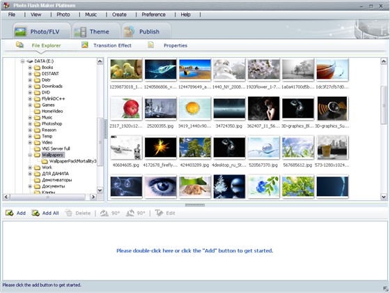 Photo Flash Maker Platinum - программа для создания анимированного FLASH-слайдшоу из обычных цифровых фотографий. Данная утилита предоставляет более 200 эффектов перехода одной фотографии в другую, имеет различные темы внешнего оформления и позволяет устанавливать музыкальное сопровождение. В настройках утилиты можно указать продолжительность показа отдельной фотографии и время ее перехода в другое изображение.