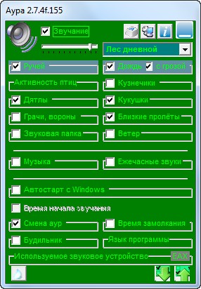 "Аура" — это программа, которая создает на вашем компьютере звуковую атмосферу дневного и ночного леса. Достаточно одного щелчка по значку, чтобы выключить или включить воспроизведение. Пульт управления, вызываемый правым кликом по значку, позволяет настроить активность птиц, цикад, ручья, водопада, дождя, грома, костра, зверей, флейты, гитары, скрипки, виолончели, назначить автоматическую смену аур (с заданной периодичностью или в соответствии с временем суток), задать автоматический старт программы при включении ПК, выбрать автоматическое выключение компьютера в заданное время (для любителей засыпать под умиротворяющие звуки леса).