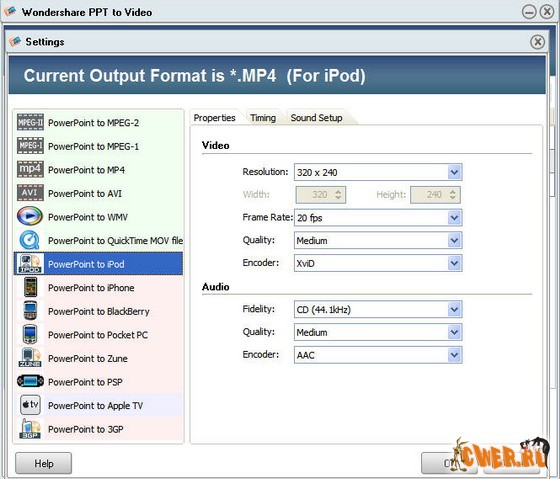 Wondershare PPT to Video это удобный конвертер презентаций PowerPoint в видео. Он поможет сконвертировать презентацию PowerPoint почти в любой видео формат: MPEG, AVI, MP4, WMV, MOV, 3GP в лучшем качестве. Программа поддерживает iPod, iPhone, Apple TV, Zune, PSP, Pocket PC, Black Berry и др. видео форматы.