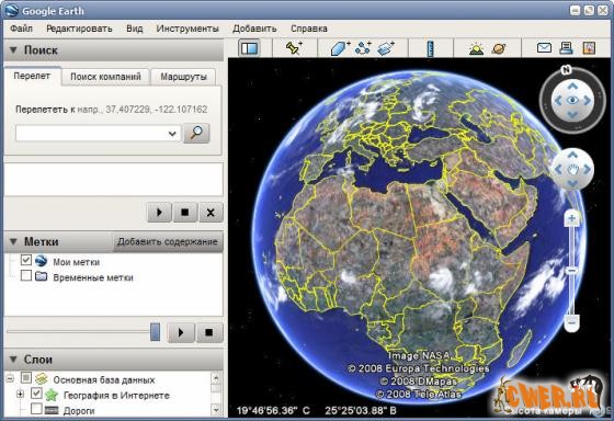 Google Earth - клиентское ПО для работы с трехмерной моделью Земли, созданной на основе спутниковых фотографий высокого разрешения. Широкие возможности по изменению масштаба изображений (иногда вплоть до отдельных домов), и многое другое, включая определение координат обьекта. Карту можно просматривать карту под любым углом; большая часть карты - это обычные 2D-фотографии, но некоторые объекты (населенные пункты) представлены в виде трехмерных моделей.