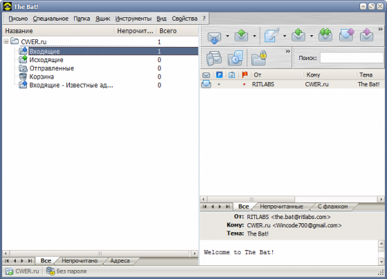 The Bat! - новая вышедшая версия почтового клиента. Поддерживаеся любое число почтовых ящиков POP и IMAP, шифрование переписки с помощью PGP , имеется мощная система сортировки почты, диспетчер писем для оповещении о приходе почты на сервер и управления входящей почтой прямо на сервере и множество других, не менее полезных возможностей. Что любопытно, довольно трудно вкратце обьяснить, чем же мышь лучше других почтовых программ (того же Outlook Express), но поверьте на слово, а лучше - убедитесь сами, что на сегодняшний день The Bat! является одной из наиболее подходящих почтовых программ для переписки на русском языке.