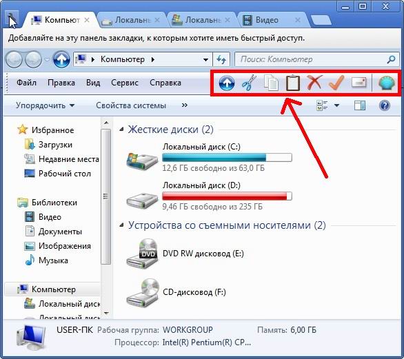 Очевидно, что на скринах - Win7. А как добавить в проводник семёрки кнопки Удалить, Вырезать, Вставить и пр.?