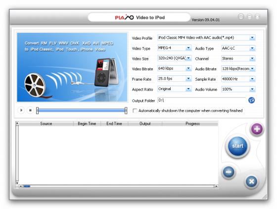 Программа для конвертирования видео в формат iPod, PSP, 3GP для просмотра на iPod, PSP (sony playstation portable), мобильных телефонах, Xbox, КПК, PMP. Способен работать почти со всеми форматами: rm, divx, xvid, avi, wmv, asf, mpg, mpeg, vob, mov, qt, vcd, svcd, Apple iPod MP4, Sony PSP MP4, 3GP, X-box MPEG2, PMP, PDA, SD Video ASF, AVI, MPG, MPEG, ASF, MOV, AMR, FLV, FLIC, SWF и другие.