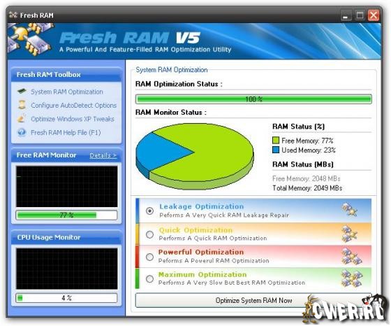 Fresh RAM - программа оптимизации оперативной памяти. Позволит очистить физическую память компьютера от неиспользуемых приложений. Имеет простой интерфейс и высокую работоспособность. Когда дело доходит до оптимизации вашей памяти, Fresh RAM принимает все действия на себя. С помощью высокой технологичности и мощной системы оптимизации, Fresh RAM ускорит производительность вашей системы, предоставит вам обратно всю истраченную операционную память. Вы получите больше операционной памяти, что позволит значительно увеличить скорость работы вашей системы, не тратя деньги на дополнительное оборудование. Fresh RAM выполняет все это очень быстрым и удобным способом, позволяя вам знать, что происходит в вашей системе и просматривать результате в режиме реального времени.