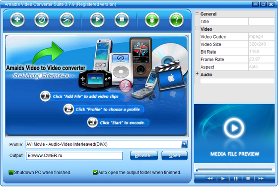 Amadis Video Converter Suite - многофункциональный видео конвертер который поможет вам преобразовать видео файлы в AVI (DivX, XviD, etc.), DV AVI, MP4 (inc. Sony PSP, Apple iPod, iPhone, AppleTV, Archos DVR, Creative Zen, MS Zune ), WMV, 3GP, 3G2, PSP, MP4, QuickTime (MOV, QT), SWF, DVD, VOB, VRO, MPEG 1, 2, MPG, DAT, VCD, SVCD, ASF, MJPEG, H.263, H.264, Real Video (RM, RMVB), DVR-MS, MKV. Программа очень проста в обращении и имеет дружелюбный интерфейс, так же достаточно шустро конвертирует ролики с хорошим качеством.
