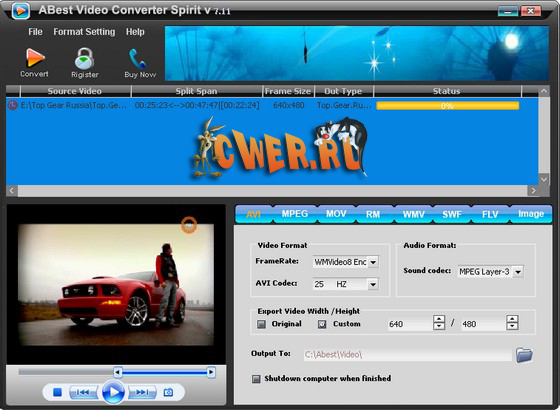 ABest Video Converter Spirit - превосходный универсальный видео конвертер, который преобразовывает видео файлы в почти все известные форматы: AVI, DivX, XviD, MPEG, VCD, DVD, WMV, MOV, ASF, QuickTime, RM, RMVB, iPod, PSP, Zune, iPhone, iTv, PPC, PMP, xBox, 3GP и другие...