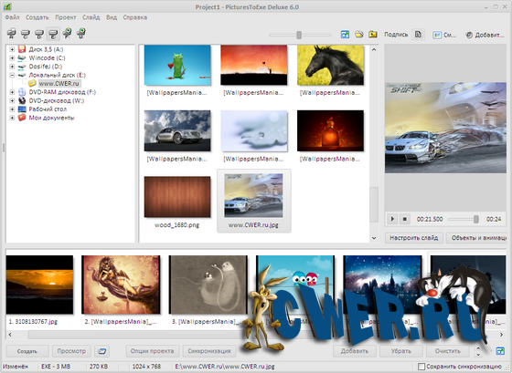 Если нужно создать слайд-шоу или "открытку" - воспользуйтесь PicturesToExe, и вся коллекция любимых картинок (bmp, jpg, gif) будет собрана в один EXE-файл, причем в создаваемый файл можно добавить музыкальные фрагменты (MIDI, WAV или MP3) или комментарии.
