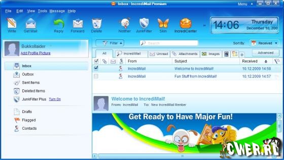 IncrediMail: Очень оригинальная почтовая программа, причем главная ее особенность - не набор функций по обработке корреспонденции (хоть и их немало), а совершенно новые, не имеющиеся ни в одной из других почтовых программ, возможности по оформлению писем с помощью анимации, создания "прыгающего" текста, включения в текст графических смайликов и многого другого, включая самые разнообразные 3D-эффекты.
