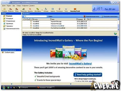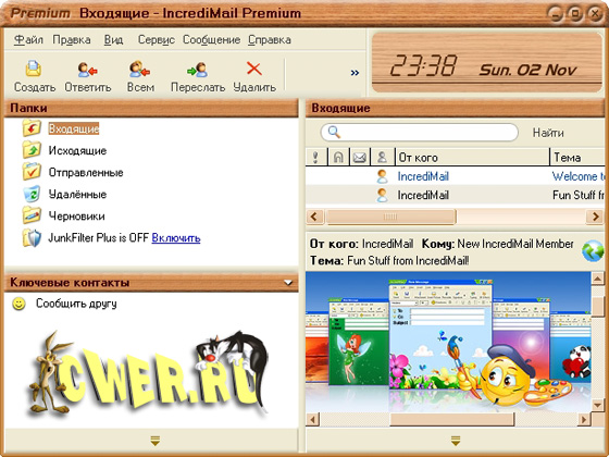 IncrediMail - очень оригинальная почтовая программа, причем главная ее особенность - не набор функций по обработке корреспонденции (хоть и их немало), а совершенно новые, не имеющиеся ни в одной из других почтовых программ, возможности по оформлению писем с помощью анимации, создания "прыгающего" текста, включения в текст графических смайликов и многого другого, включая самые разнообразные 3D-эффекты. Результатом всего этого станет то, что самое обычное письмо превратится в настоящее произведение искусства (если, конечно, вы не переборщите с эффектами) с вашей личной подписью - встроенный в программу редактор позволяет вытворять и не такое (кстати, эта опция может очень пригодиться для подготовки бланков "деловых" писем).