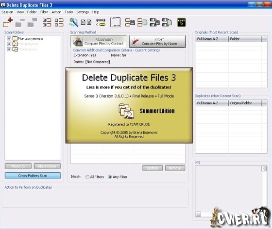 Clone Remover Pro - программа для поиска дубликатов файлов. Поможет найти одинаковые файлы, находящиеся в разных местах (жестких дисках, CD, DVD и т.д.) вашего компьютера, даже если названия файлов не совпадают. Поиск дубликатов файлов в этой программе осуществляется двумя нажатиями кнопок, т.к. программа очень проста в использовании и не требует особых навыков работы с компьютером. Если, что-то будет не понятно, вы сможете воспользоваться системой помощи, встроенной в программу. Даже ради интереса, знать сколько одинаковых файлов скопилось у вас на носителях информации - очень полезно.
