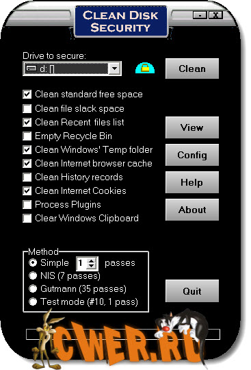 Clean Disk Security - программа для безопасного удаления файлов. Она дает гарантию, что после удаления с жесткого диска исчезает не только запись о файле, но и сам файл, и восстановить его невозможно. Clean Disk Security также может очищать файл подкачки, временные файлы, которые не используются (например, занесенные в Корзину, кеш браузера и пр.). В программу также встроен просмотрщик жесткого диска, который поможет найти все скрытые файлы и папки на нем.