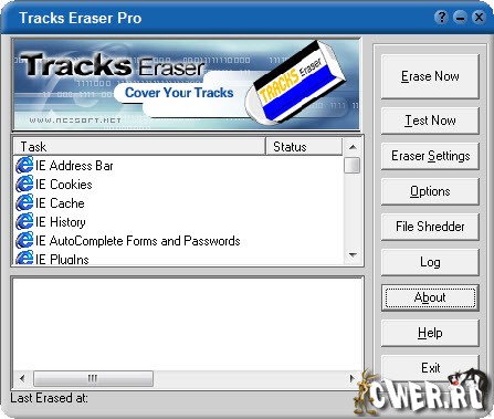 Tracks Eraser Pro - утилита для удаления ненужной информации с вашего ПК. Она встраивается в Internet Explorer и проводит очистку, интернет файлов таких как ( куки, URL, кэш, переходы и т.д. ). Программа позволяет очищать адресную строку истории для IE, Netscape, AOL, Opera. Удаляет куки для IE, Netscape, AOL, Opera. Очищает Internet кэш (временные Интернет файлы), удаляет интернет историю файлов, интернет историю поиска, удаляет IE плагины по выбору, index.dat файлы, Старт Меню. Удаляет временные файлы Windows, историю сохраненых dialog box.