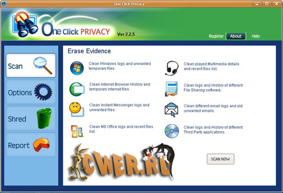 Маленькая, компактная программа One Click Privacy автоматически или всего одним щелчком, подтирает историю и следы интернет - активности от злонамеренного или любопытного глаза. Убирает историю браузеров, куки, вводимые пароли, ID's, банковские операции и информацию о кредитных картах. Убирает следы работ пиринговых клиентов, включая Bit Torrent Client, Kazaa, LimeWire, Morpheus и других. Стирает следы переписки и голосовые протоколы и т д.