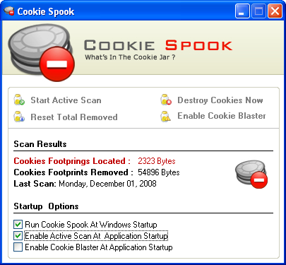 Утилита для удаления сookie-файлов, содержащих в себе много информации о web-серфинге пользования. Программа содержит сканер, который в реальном времени находит сookie и может удалять их как автоматически, по мере обнаружения, или только по требованию пользователя. Программа совместима с браузерами Internet Explorer, Firefox, Opera и Google Chrome.