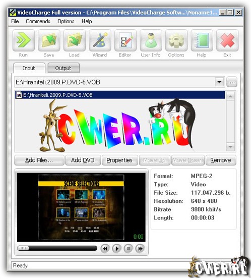 VideoCharge Full - программа, обладающая множеством возможностей, которые позволяют совершать любые операции с видео файлами за несколько кликов мыши. Программа может быть использована для разрезки видео и аудио файлов на несколько частей, объединения нескольких файлов в один большой медиа файл, извлечения или удаления сцен в видео роликах, создания эскизов изображений из видео файлов, добавления водяных знаков на видео и графические файлы, пакетной обработки нескольких изображений и многого другого. Кроме того, утилита позволяет обрабатывать на лету видео файлы (без декомпрессии и последовательного сжатия каждого кадра), имеет поддержку работы через командную строку, а также включает в себя встроенный FTP клиент для публикации готовых файлов в сети. Программа оптимизирована для обработки большого объема файлов и поддерживает большинство популярных видео и графических форматов.