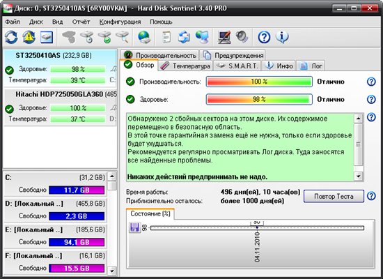 CrystalDiskInfo - отслеживает состояние жестких дисков, поддерживающих технологию S.M.A.R.T. Производит мониторинг и дает общую оценку "здоровья" вашего диска. Так же отображает детальную информацию о жестких дисках, установленных в компьютере (прошивка, серийный номер, стандарт, интерфейс, общее время работы и др.), а также выводит параметры атрибутов системы самодиагностики S.M.A.R.T. (ошибки чтения, производительность, запуски/остановки шпинделя, время поиска дорожки, количество циклов включения-выключения, ошибки секторов и многое другое).