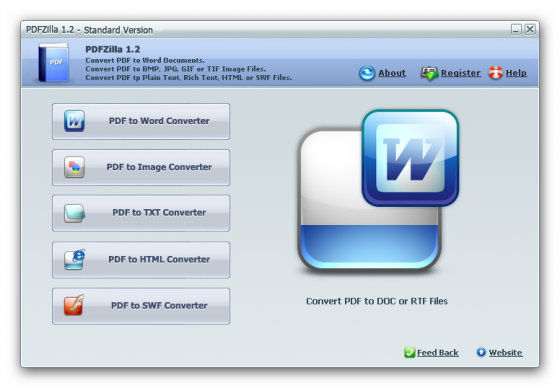 PDFZilla - программа которая быстро и аккуратно конвертирует PDF файлы в документы MS Word, документы Rich Text, текстовые файлы, изображения, HTML файлы и Flash SWF файлы.
